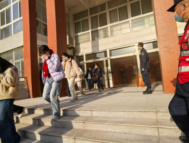 应急疏散演练阶段,赵远老师首先向师生们讲解了逃生疏散注意事项,强调要保持镇定、动作规范、按规定线路疏散。15:30时,疏散演练正式开始。楼宇值班员接到火情报告后,长鸣哨声并广播“出现火情,立即疏散”。随着火灾警报拉响,疏导员立刻就位,迅速组织楼内的师生从安全通道有序疏散,撤离到教学楼外空旷场地。整个演练过程组织有序、行动高效,展现了学院师生们的应急处理能力和团队合作精神。