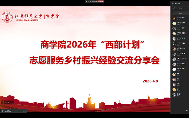 为引导青年学子扎根基层、服务乡村,4月8日晚,商学院举办2026年“西部计划”“志愿服务乡村振兴计划”经验分享交流会。活动邀请2025届毕业生席文博、韩兆席、卢浩宇三位优秀校友分享实践经验,40余名同学参与交流。