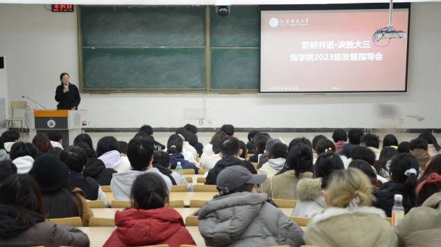 为帮助大三学生准确把握当前升学与就业形势,进一步明确个人发展方向,商学院于12月10日15:30在教#42阶101教室组织召开了2023级本科生年级大会。商学院党委书记李亚东、副书记赵苁蓉、副院长郑琼出席大会并作升学规划和就业指导。